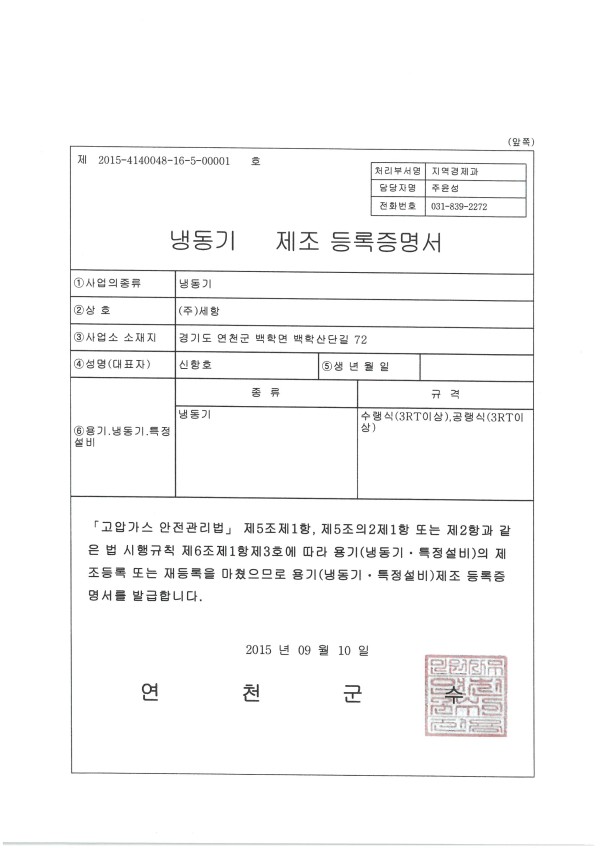 허가관련 냉동기제조등록증명서